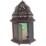The graceful cutouts in this candle lantern's shell throw dancing laceworks of light, while patterned green glass panels cast a halo of color. Suitable for hanging, or use as a free-standing lamp. Uses pillar or votive candles (item #35844 or 35847; not included). Metal with colored glass panels. 6 1/2'' x 7 1/2'' x 13'' high. Candle not included. Read more