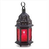 Deep red pressed-glass panels and lacy cutouts transform candlelight into a mesmerizing dance, lavishing the night with a mystical glow. A glorious mix of color and light! Metal and glass. Candle not included. 4 1/2 inches x 3 3/4 inches x 10 1/4 inches high. Read more